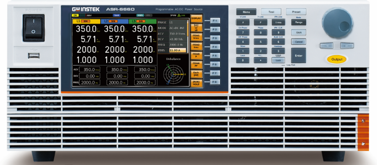 ASR-6000 oferuje pełną kontrolę nad charakterystyką wyjściową – od zrównoważonych układów trójfazowych po symulację utraty fazy. Zakres częstotliwości od 15 Hz do 2000 Hz (AC) oraz od 1 Hz do 2000 Hz (AC+DC) umożliwia precyzyjne testy. Monitorowanie napięcia i prądu odbywa się na dwóch kanałach z analizą harmonicznych. W konfiguracji równoległej można osiągnąć moc aż do 39,6 kVA, co czyni ASR-6000 jednym z najbardziej wszechstronnych narzędzi na rynku.