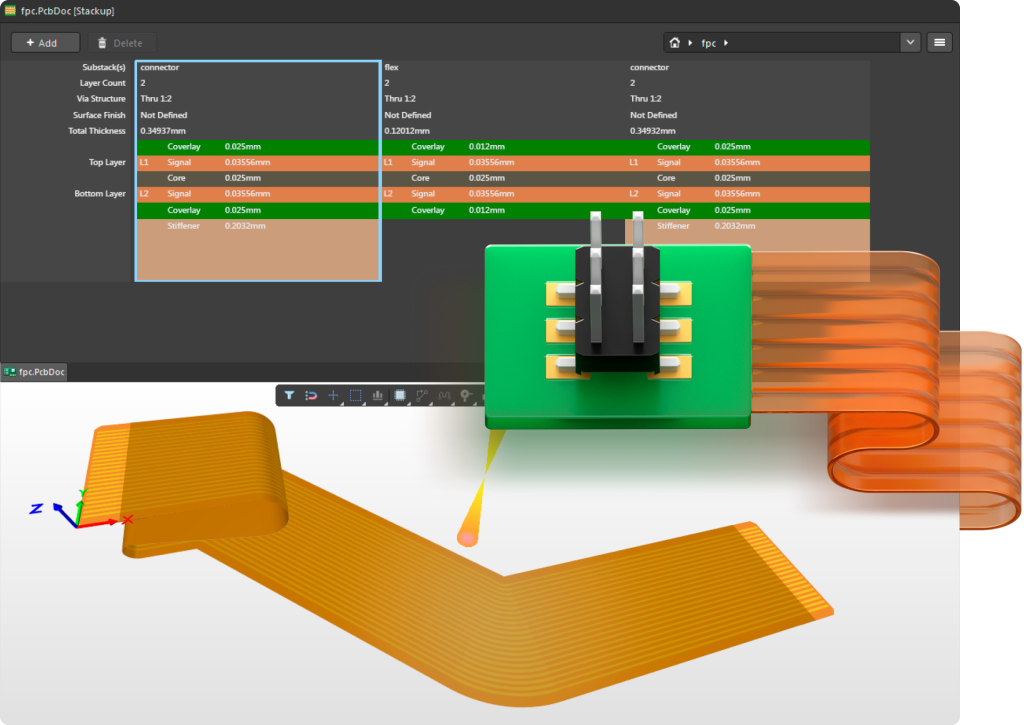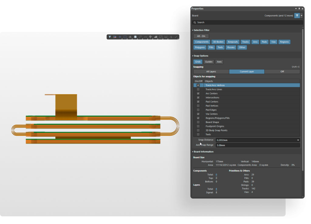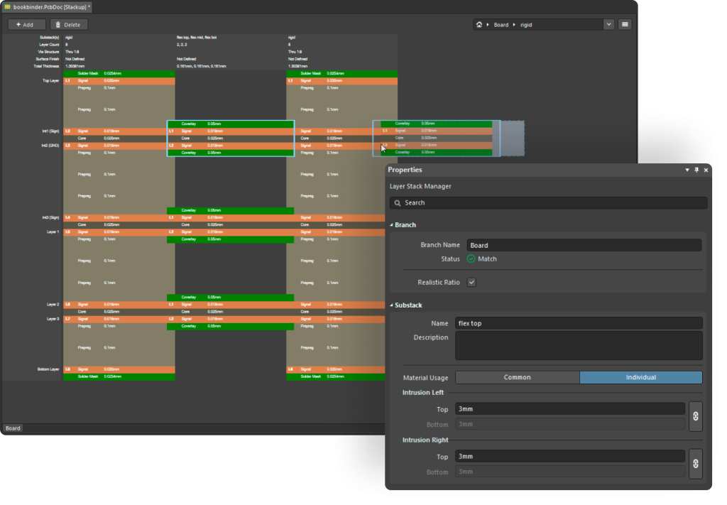 Uzyskaj przejrzysty obraz swojej płytki Rigid-Flex dzięki wysokiej jakości wizualizacjom w Altium Designer. Menedżer stosu warstw umożliwia łatwe zrozumienie funkcji każdej warstwy i sekcji elastycznej.